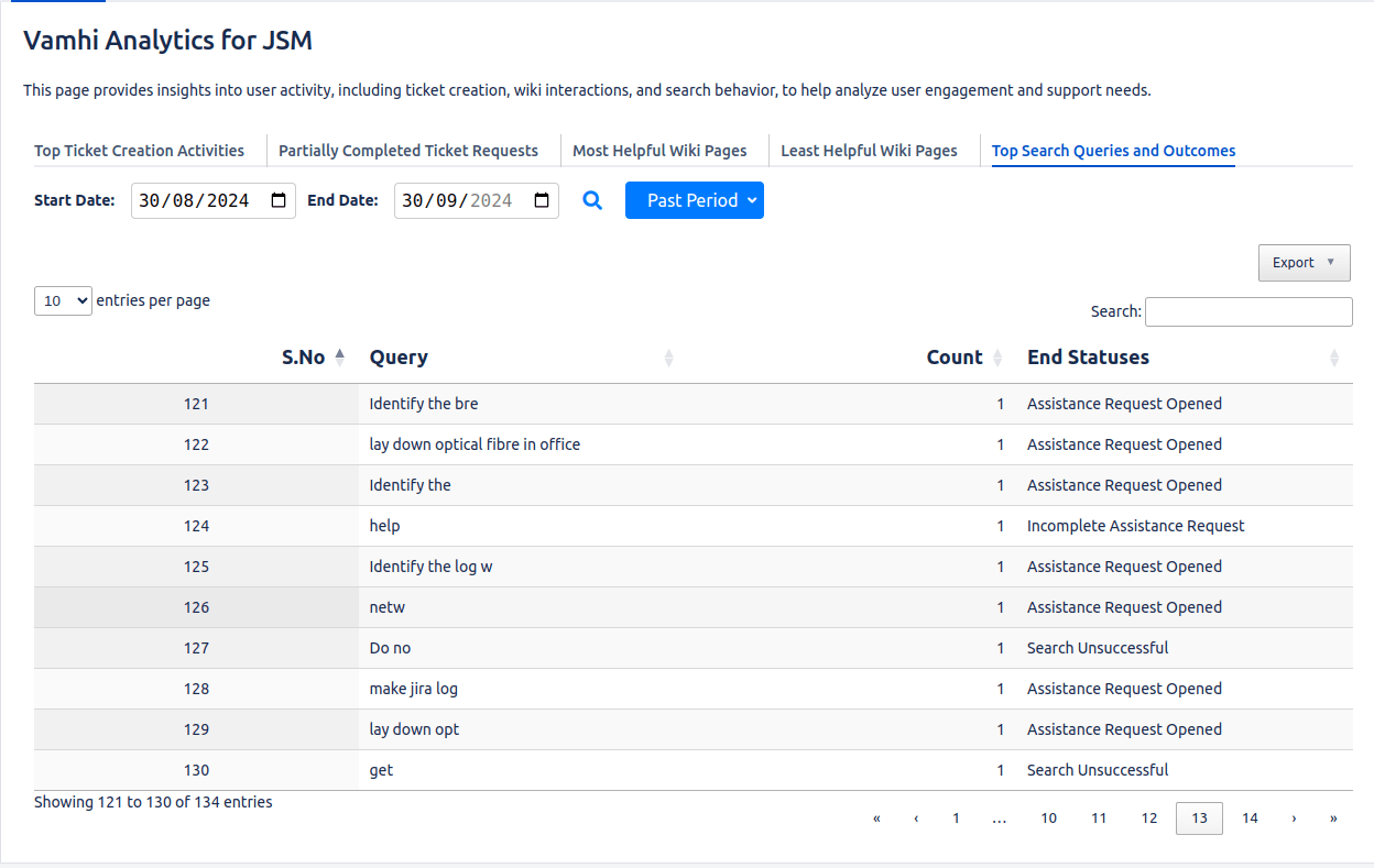 Track and analyze customer activities like ticket submissions, queries, and wiki interactions on the JSM Help Center, providing a clear understanding of user behavior.