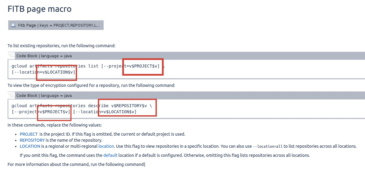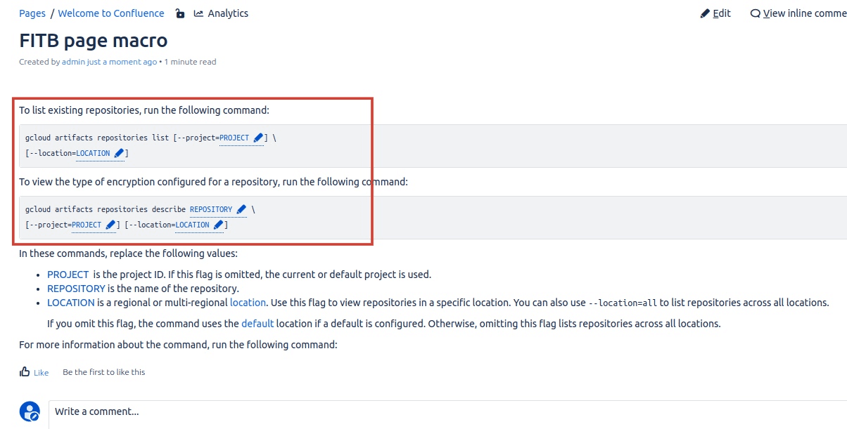 Fill In The Blanks converts static code and command snippets in Confluence into interactive input boxes using simple tags. Readers can adjust parameters directly in the page instead of copying content out to a notepad.